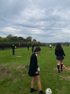 Imaginad un campo de golf, pero cambiando los palos y las pelotas pequeñas por… ¡una pelota de fútbol y nuestras propias piernas! 😅 Cada hoyo era más complejo que el anterior, ¡fue un verdadero reto! Pero, al tener que pensar en cómo golear la pelota con estrategias y obstáculos diferentes para cada hoyo, pudimos entretenernos y pasar un muy buen rato.