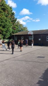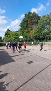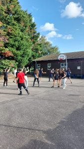 Al acabar las clases nos cambiamos rápido y nos acercamos a la canchas preparados para el partido de baloncesto. Calentar un poco, un trote por aquí, unas vueltas por allá y listos para empezar!
