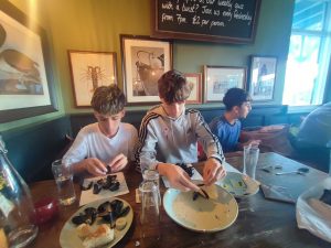 Nos invitaron a comer mejillones en salsa y diferentes tipos de pan inglés. ¡Creo que a vuestros chicos y chicas les encantaron porque cuando fui a hacer las fotos casi no quedaba nada! Hasta rebañaron la salsa.
