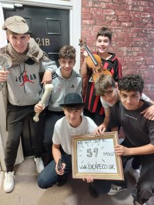 • El primer grupo, formado por Pedro, Miguel, Martín, Álex, Anxo y Hugo, entró en la sala de The Game’s Afoot. Los chicos tuvieron que convertirse en detectives para poder resolver un misterio al puro estilo Sherlock Holmes. El desafío consistía en ayudar a este famoso detective y a su ayudante Watson, para poder frenar los planes de su archienemigo Moriarty. ¡Y lo lograron! Completaron la prueba en 59 minutos.