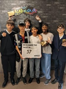 • El segundo grupo estaba formado por Matías Contreras, Matías Teruel, Rhoda, Alexandre, David y Javier Iglesias, que tenían que conseguir robar un banco en un tiempo limitado, o les pillarían. Entraron en la sala llamada The Vault. Este scape room era el más difícil de todos y lo consiguieron completar nada más y nada menos que ¡en 57 minutos! No está nada mal, creedme. ¡Salieron con las manos llenas de billetes y lingotes de oro!
