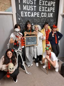 • Y por último, el tercer grupo formado por Carmen, Hadassa, Luis, Juan, Néstor y Daniel entraron en la sala de E= MC Scared! Yo misma les acompañé, y tuvimos escapar de un profesor de ciencias loco que nos había encerrado en una celda para utilizar con nosotros una máquina par cerebros que nos robaba la inteligencia. Nos llevamos algún que otro susto, ¡pero pudimos escapar sin problemas en 52 minutos! Fue muy divertido.