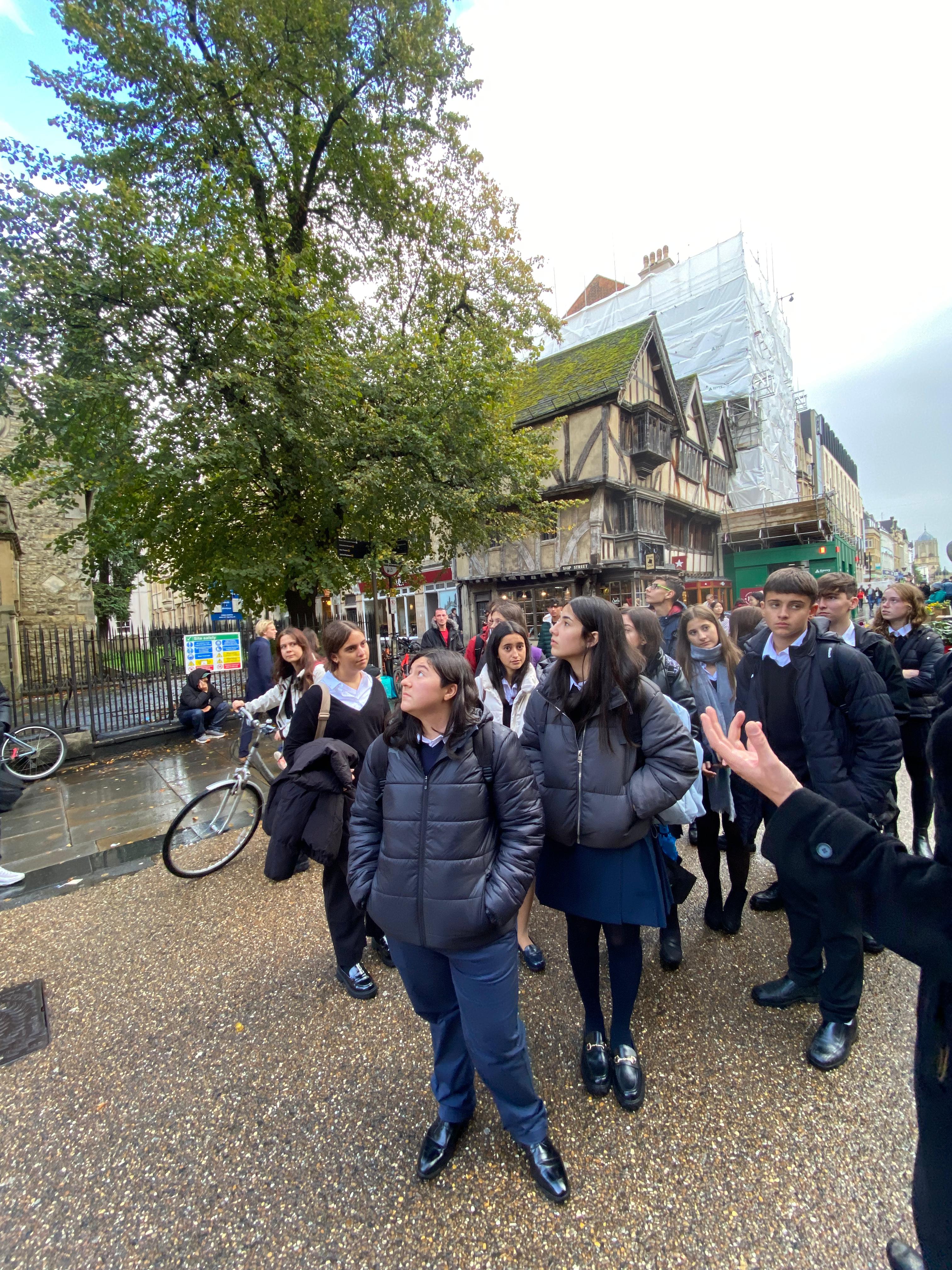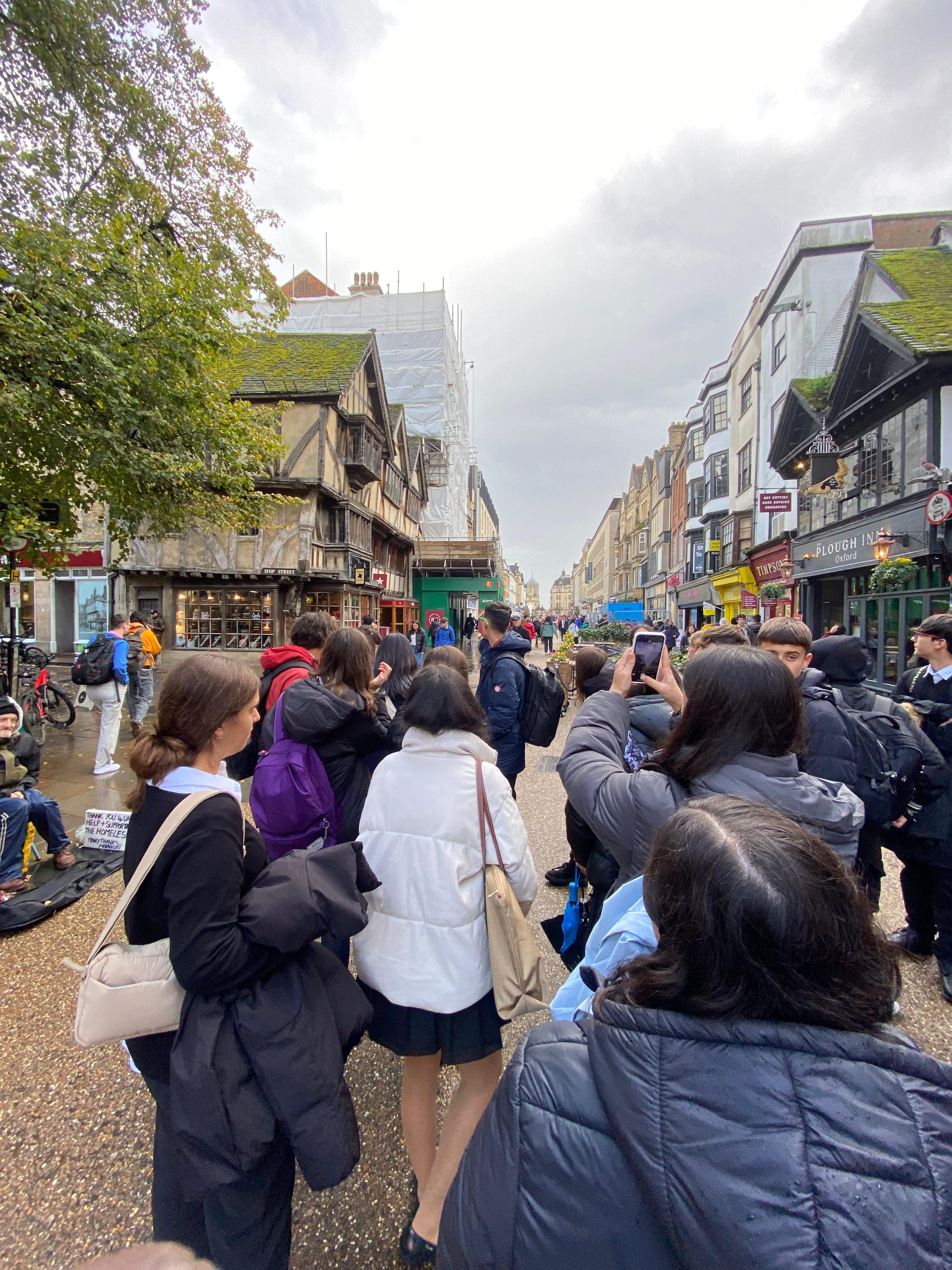 Así, pasamos por Turf Tavern, ubicado cerca de High Street, en el centro de Oxford. Luego, nos dirigimos a un lugar donde aprendimos que las estructuras de las casas tienen una planta baja de reducido tamaño, un primer piso más grande y el último piso es el más grande de todos. ¡El edificio es de estilo Tudor!