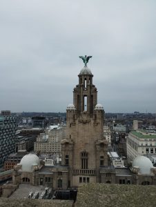 El lunes por la tarde tuvimos un tour cortito pero muy chulo: visita al interior y exterior del Royal Liver Building, el primer rascacielos de su época, con un reloj más grande que el Big Ben y unas vistas del Mersey, los muelles y Wirral impresionantes. Tuvimos que subir bastantes escaleras y pasar un poco de vértigo, pero valió la pena: